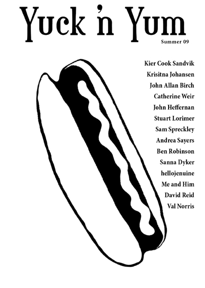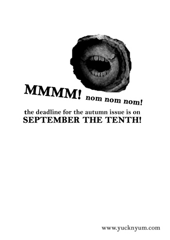 The idea of distribution behind Yuck ‘n Yum is that it can be viewed online and/or printed off on the viewer’s home printer. As a result, the printed image must be black and white, and high contrast images work best due to differing print qualities. You can submit one piece for both methods, or you might prefer to produce something for the online version that differs slightly from the printed version or complements or references it – something which takes advantage of the media it is presented in, such as an audio project, a short video piece, or animation, for example. It’s totally up to you.