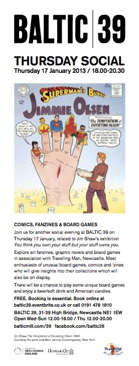 The latest edition of Yuck ‘n Yum will feature at tonight’s event at the BALTIC 39 space in Newcastle as part of Jim Shaw’s exhibition You think you own your stuff but your stuff owns you.  The event explore art fanzines, graphic novels and board games in association with Travelling Man, Newcastle. Yuck ‘n Yum will be amongst enthusiasts of unusual board games, comics and ‘zines who will give insights into their collections which will  also be on display. There will be a chance to play some unique board games and enjoy a beer/soft drink and American candies.  It looks to be a fun night!