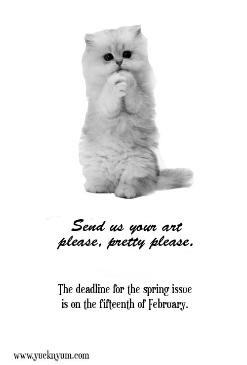The deadline for the spring issue has been extended, so please send us your black and white artworks to submissions@yucknyum.org by March 15th. Both digital works and high quality scans of original artworks are accepted. If you’re unsure of format etc, please cast your eye over ‘How to submit‘.