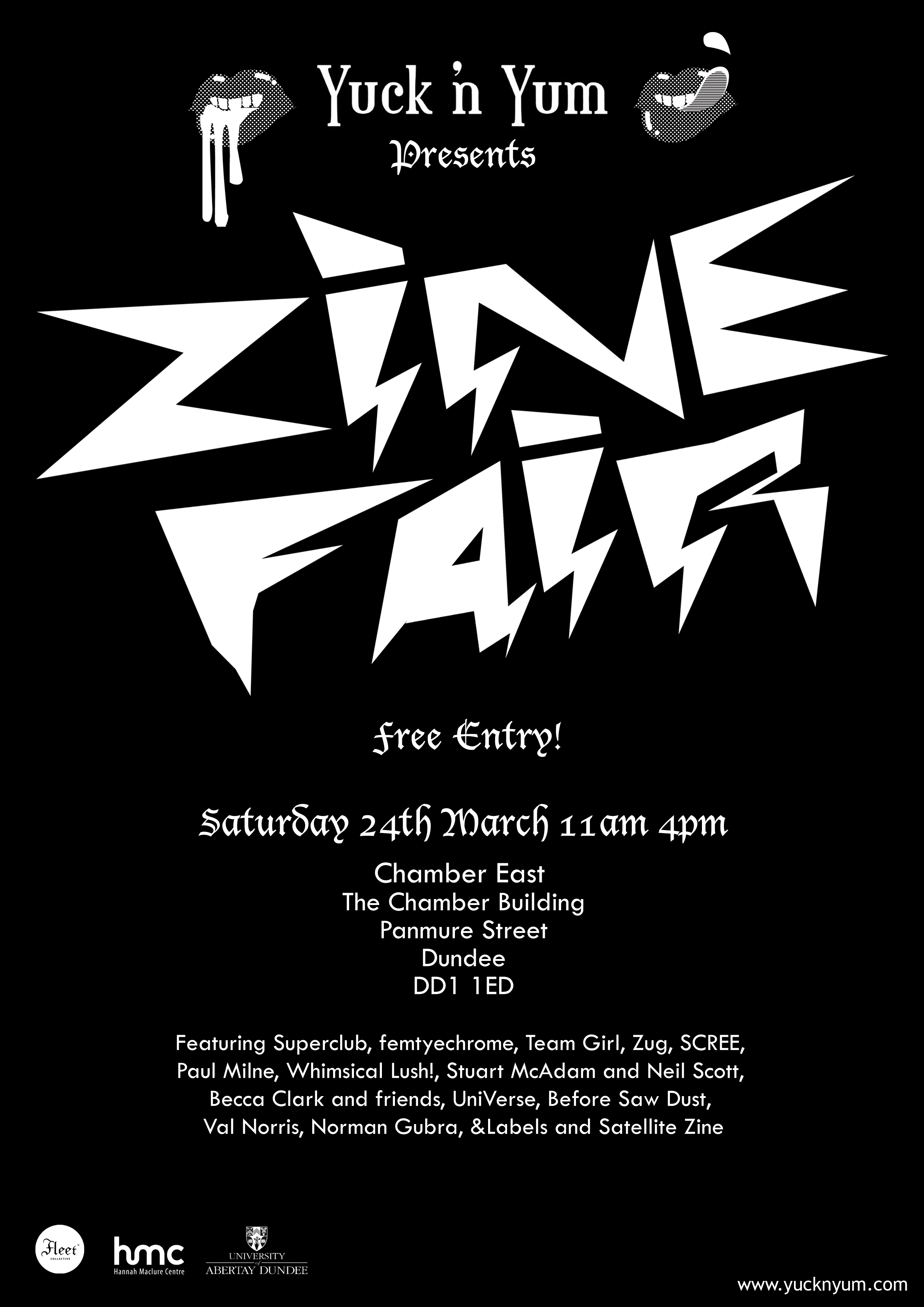 Superclub, femtyechrome, Team Girl, Zug, SCREE, Paul Milne, Whimsical Lush!, Stuart McAdam and Neil Scott, Becca Clark and friends, UniVerse, Before Saw Dust, Val Norris, Norman Gubra and &Labels and Satellite Zine. + we will also have a FREE table where information, free zines and the likes can be left for people to pick up at their own choosing.