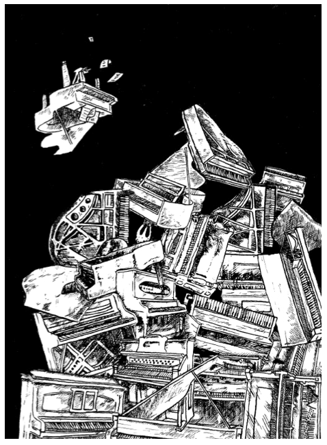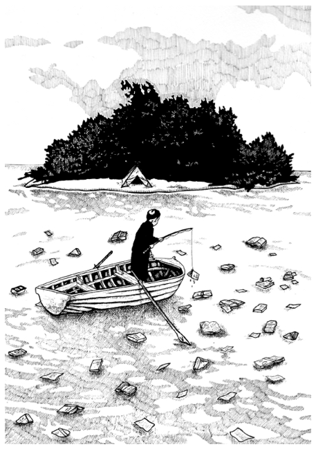 He describes it as ‘A mess of drawings and lies concerning giant birds, dying ghosts, haunted boats, dogs carved into cliff faces, enormous brains in glass spheres, waterfalls of pianos, mutilation (self and general), rivers of blood, flooded hotels, dangerous playgrounds, accidental murders, magical circuses, abandoned mazes, pointless rituals, headless swordfighters, ballet-dancing goats, endless staircases, cavernous graves and deserted hotels pitching themselves into the sea.’