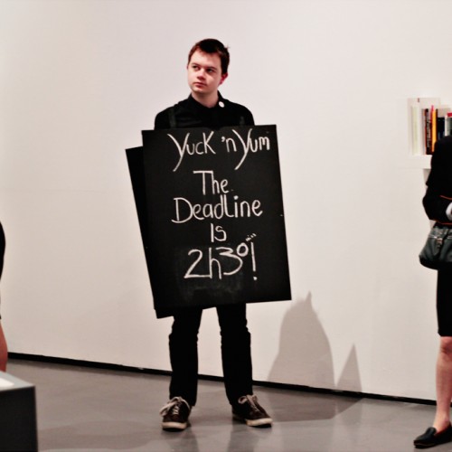 In 2011 we created ‘The Deadline is Nigh’ – a live work responding to the notions of the book and reading for the relaunch of the Centre of Artist Books, Visual Research Centre, DCA. Over the course of the month of May Yuck ‘n Yum ‘live curated’ a special edition of our zine from submission, selection, printing and distribution.